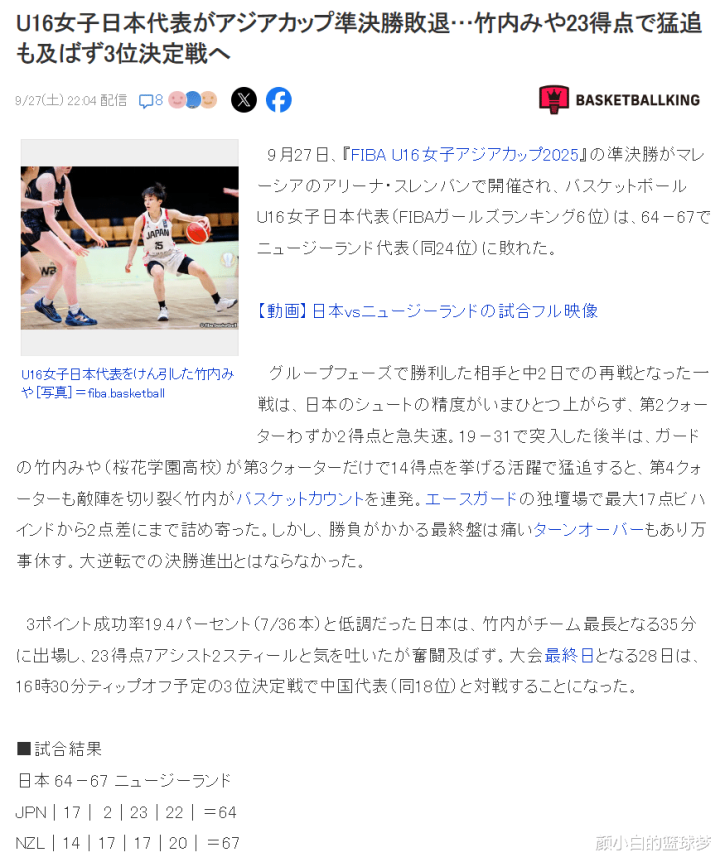 赛后日本媒体《BasketballKing》发文:竹内美也选手狂砍23分在半决赛中不敌新西兰队无缘决赛,日本U16女篮自参与亚洲杯以来连续三届进入决赛的纪录就这样被终结了。