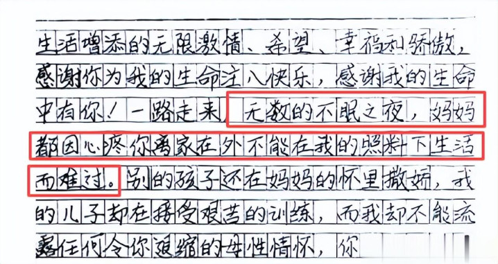 “别的孩子还在妈妈怀里撒娇,我的儿子却要在接受艰苦的训练,而我却不能流露任何令你退缩的母性情怀。