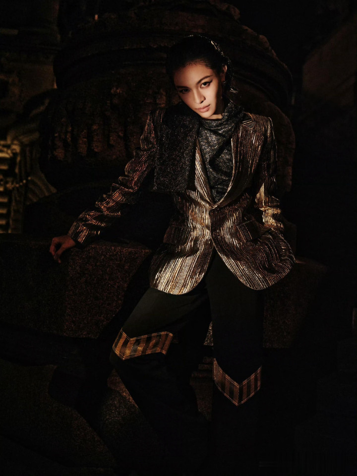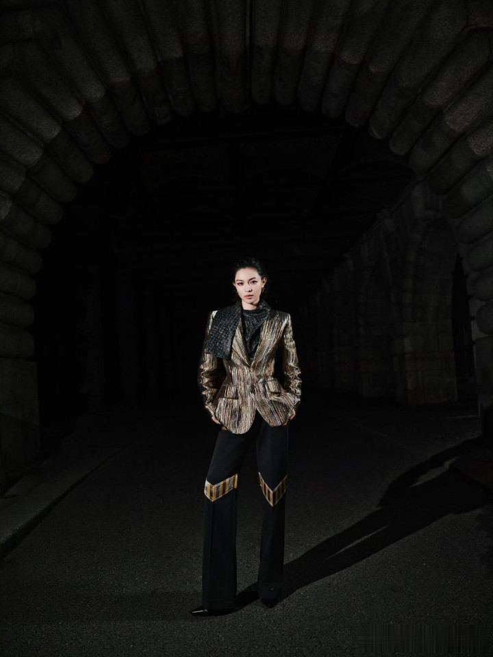 钟楚曦LV大秀金丝西装湿短发吸睛